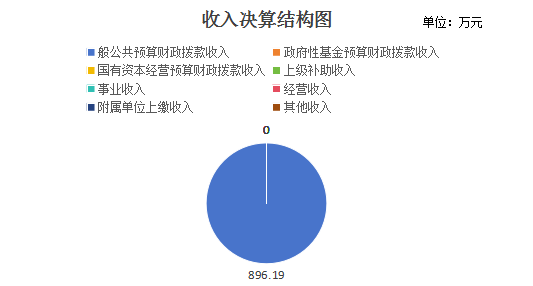 2023年度本年收入合计896.19万元,其中:一般公共预算财政拨款收入896.19万元,占100%;政府性基金预算财政拨款收入0万元,占0%;国有资本经营预算财政拨款收入0万元,占0%;上级补助收入0万元,占0%;事业收入0万元,占0%;经营收入0万元,占0%;附属单位上缴收入0万元,占0%;其他收入0万元,占0%。