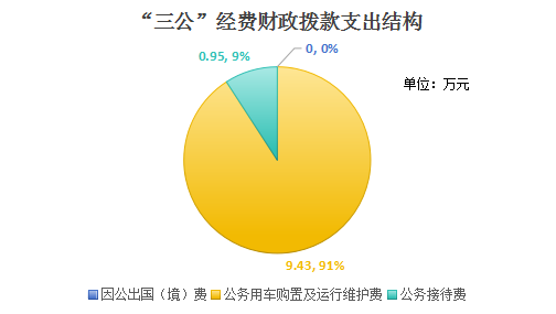 2023年度“三公”经费财政拨款支出决算中,因公出国(境)费支出决算0万元,占0%;公务用车购置及运行维护费支出决算9.43万元,占90.88%;公务接待费支出决算0.95万元,占9.11%。具体情况如下: