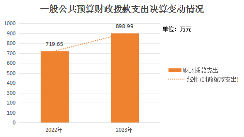 2023年度财政拨款收、支总计均为898.99万元。与2022年度相比,财政拨款收入总计增加179.14万元、支出总计增加179.34万元,分别上升24.89%、24.92%。主要变动原因是项目工作开展内容增多,省级补助项目经费增加。