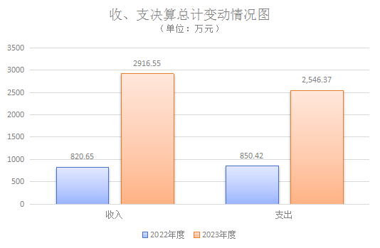 2023年度收、支总计均为3097.24万元。与2022年度相比,收、支总计均增加2072.64万元,增长202.29%。2023年度年初结转和结余180.68万元,2023年度收入2916.55万元,与2022年度820.65万元相比,收入增加2095.9万元,增长255.4%;2023年度年末结转和结余351.69万元,结余分配199.17万元,2023年度支出2546.37万元,与2022年度850.42万元相比,支出增加1695.95万元,增长199.42%。主要变动原因是青川县妇幼保健院与乔庄镇中心卫生院机构合并,被合并单位数据统一报送,原乔庄镇中心卫生院职能由本院承担,卫生院职能职责项目经费增加、人员增加,相应人员经费、日常公用经费增加,故本年收入、支出增加较大。