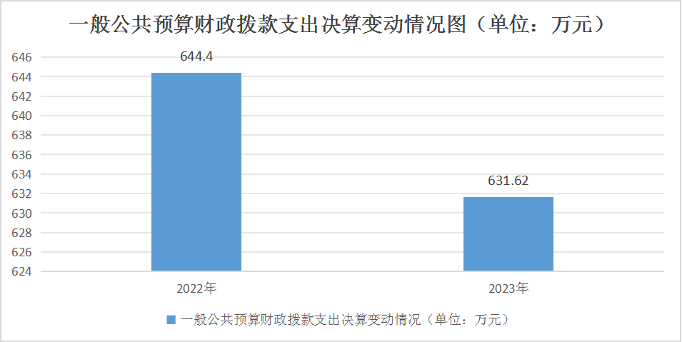 2023年度一般公共预算财政拨款支出631.62万元,占本年支出合计的95.36%。与2022年度相比,一般公共预算财政拨款支出减少12.78万元,下降1.98%。主要变动原因是是人员减少,工资福利支出减少。