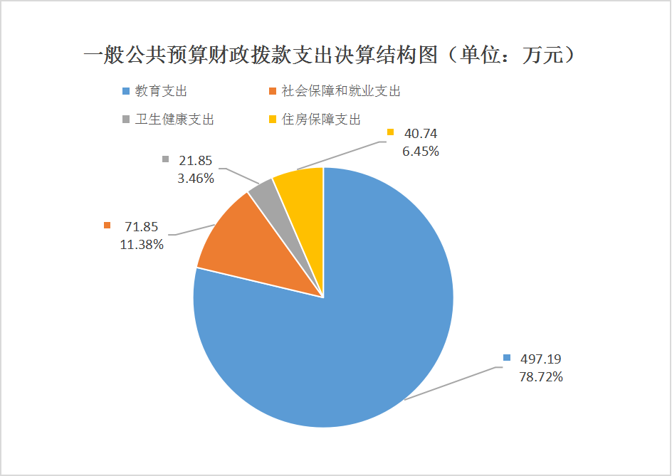2023年度一般公共预算财政拨款支出631.62万元,主要用于以下方面:教育支出497.19万元,占78.72%;社会保障和就业支出71.85万元,占11.38%;卫生健康支出21.85万元,占3.46%;住房保障支出40.74万元,占6.45%。