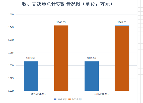 2023年度收、支总计均为1045.63万元。与2022年度相比,收、支总计各减少14.07万元,下降1.36%。主要变动原因是人员调出,工资福利支出减少。