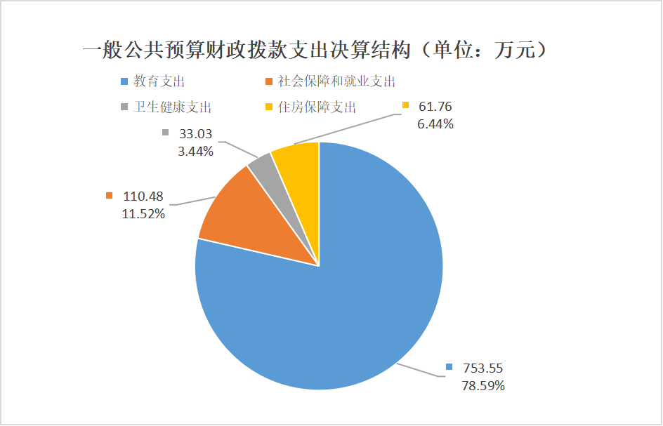 2023年度一般公共预算财政拨款支出958.81万元,主要用于以下方面:教育支出753.55万元,占78.59%;社会保障和就业支出110.48万元,占11.52%;卫生健康支出33.03万元,占3.44%;住房保障支出61.76万元,占6.44%。