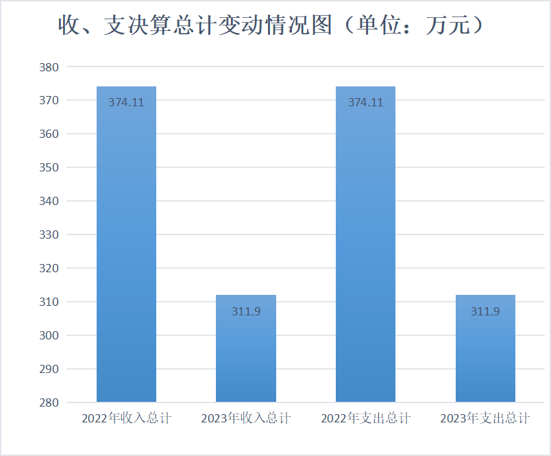 2023年度收、支总计均为311.9万元。与2022年度相比,收、支总计减少62.21万元,下降16.63%。主要变动原因是维修改造工程部分款项在2022年拨付和支付。