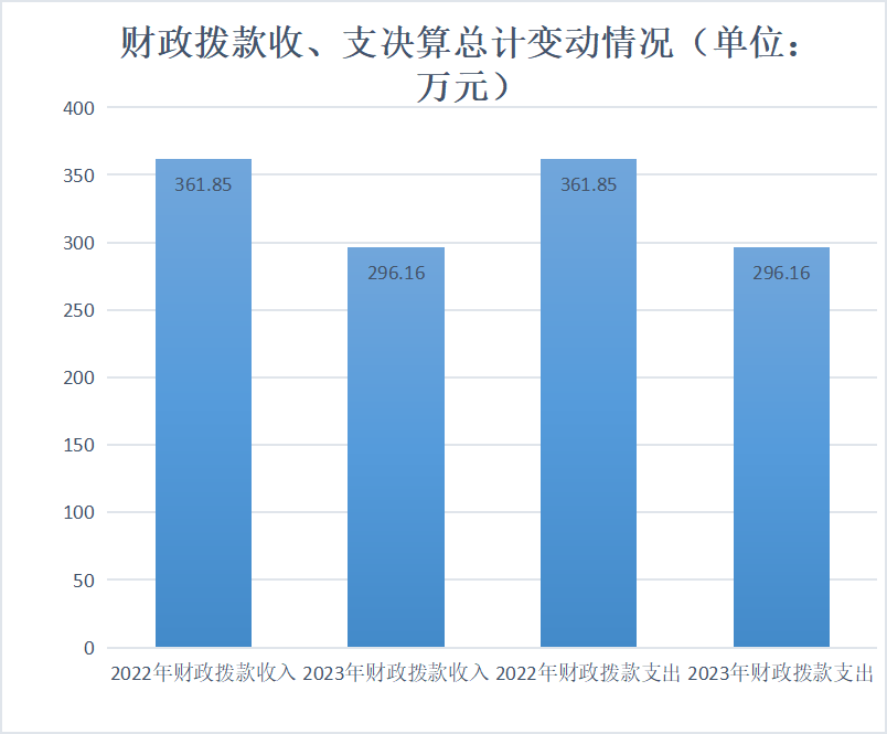 2023年度财政拨款收、支总计均为296.16万元。与2022年度相比,财政拨款收、支总计减少65.69万元,下降18.15%。主要变动原因是维修改造工程部分款项在2022年拨付和支付。
