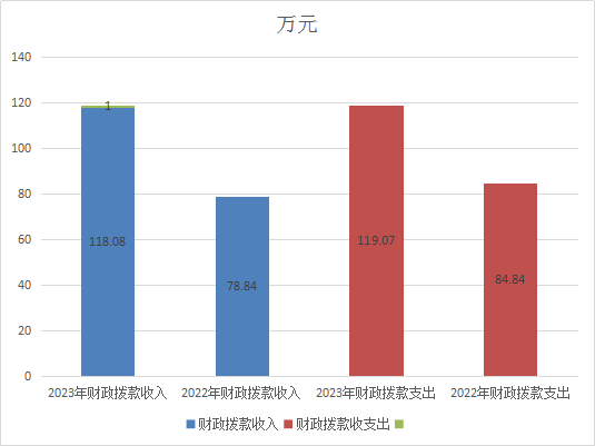 2023年财政拨款收入总计118.08万元,与2022年相比,财政拨款收入增长39.24万元,增长49.77%。财政拨款支出总增长118.08万元。与2022年相比,财政拨款支出增长33.24万元,增长39.18%。财政收入变动原因为增加公共服务岗1人、正常调资进级、上年财政收回补助年初增加、基础绩效奖全部计入保险基数,单位保险部分预算增加;支出主要变动原因是正常人员调资财政补助有增加、支出人员经费同时增加、保险增加,上年财政收回补助未支付今年支付。