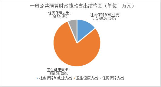 2023年度一般公共预算财政拨款支出422.7万元,主要用于以下方面:社会保障和就业支出60.07万元,占14.21%;卫生健康支出336.05万元,占比79.5%;住房保障支出26.58万元,占6.29%。