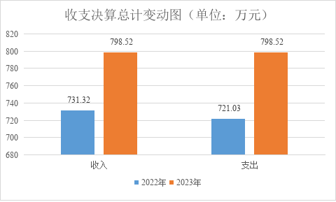 2023年度收、支总计均为798.52万元。与2022年度相比,收入增加67.2万元、增加9.19%,主要变动原因为事业收入增加。支总增加77.49万元,增长10.74%。主要变动原因为人员经费、日常公用经费支出相应增加。