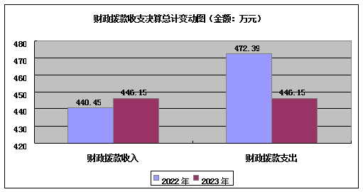2023年度财政拨款收入、支出总计均为446.15万元。与2022年度相比,财政拨款收入减少5.7万元,减少1.29%,主要变动原因为退休人员减少,人员经费减少。支出减少26.24万元,减少5.55%,主要变动原因是项目经费支出减少。