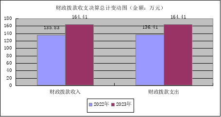 2023年度财政拨款收、支总计均为164.41万元。与2022年度相比,财政拨款收入增加3.38万元,增长2.49%,主要变动原因是项目拨款收入增加。支出总计各增加15.92万元,增长11.67%,主要变动原因是人员增加人员经费及日常公用经费支出增加。