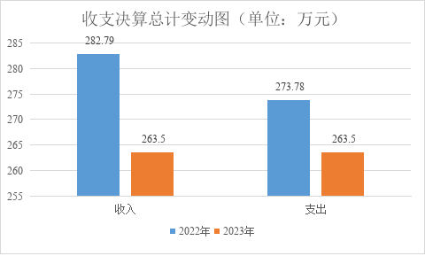 2023年度收、支总计均为263.5万元。与2022年度相比,收入减少19.29万元,减少6.82%,主要变动原因是事业收入减少10.28万元,支出下降3.75%,增加主要变动原因是项目支出减少。