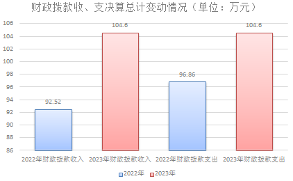 2023年度财政拨款收、支总计均为104.6万元。与2022年度相比,财政拨款收入增加12.08万元、支出总计增加7.74万元,各增长13.06%、7.99%。变动原因2023年工资调标,人员经费增加,故财政拨款收入及支出增加。