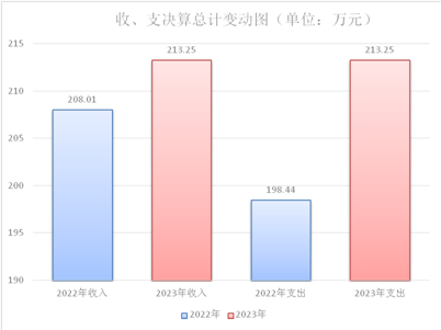 2023年度收、支总计均为213.25万元。与2022年度相比,与2022年度相比,收入总计增加5.24万元、支出总计增加14.81万元,分别增加2.52%、7.46%。收入主要变动原因是本年财政拨款收入增加,故本年度收入增加;支出主要变动原因是人员经费和公用经费增加,支出相应增加。