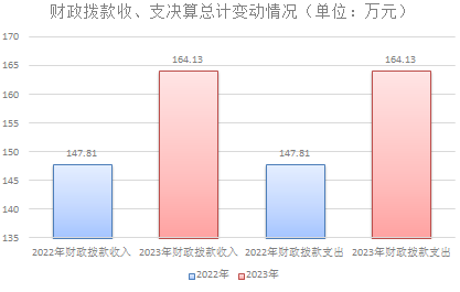 2023年度财政拨款收、支总计均为164.13万元。与2022年度相比,财政拨款收、支总计各增加16.32万元,增长11.04%。主要变动原因是财政拨款结转资金费用增加,收入支出相应增加。