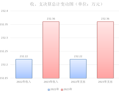 2023年度收、支总计均为232.36万元。与2022年度相比,收、支总计各增加0.14万元,增长0.06%。主要变动原因是财政拨款结转资金费用增加,收入支出相应增加。