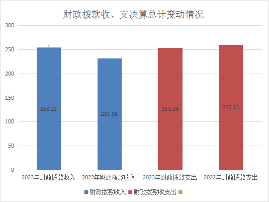 2023年度财政拨款收、支总计均为253.23万元。与2022年度相比,财政拨款收入总计增加21.25万元,增长9.16%、支出总计减少6.9万元,下降2.65%。主要变动原因是正常人员调资人员经费增加,单位部分预算增加。