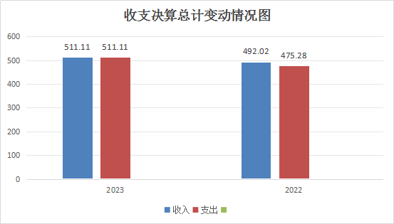2023年度收、支总计均为511.11万元。与2022年度相比,收入总计增加19.09万元,增长3.88%、支出总计增加35.83万元,增长7.54%。主要变动原因是本年项目增加,财政拨款增加,同时本年医疗服务能力提升,业务收入增加,故本年度收入增加;支出主要变动原因是本年新增一名人员,工资及各项公用经费增加,支出相应增加。