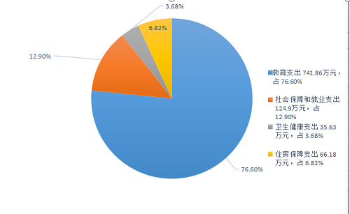 2023年度一般公共预算财政拨款支出968.57万元,主要用于以下方面:一般公共服务支出0万元,占0%;教育支出741.86万元,占76.6%;科学技术支出0万元,占0%;文化旅游体育与传媒支出0万元,占0%;社会保障和就业支出124.9万元,占12.9%;卫生健康支出35.63万元,占3.68%;住房保障支出66.18万元,占6.82%。
