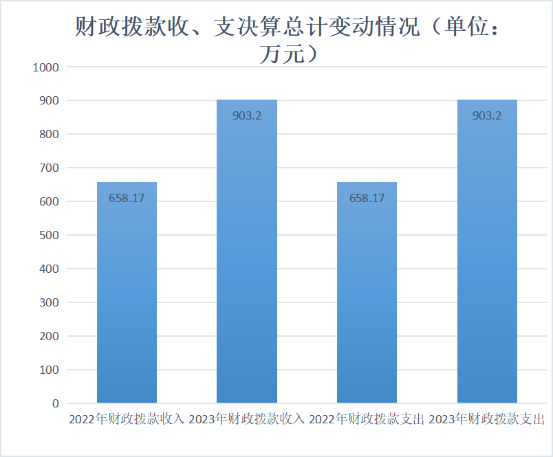 2023年度财政拨款收、支总计均为903.2万元。与2022年度相比,财政拨款收、支总计各增加245.03万元,增长37.22%。主要变动原因一是教师正常晋升及岗位变动工资增加,二是各类保险基数增加,保险缴费增加。三是公用经费财政拨款增加。