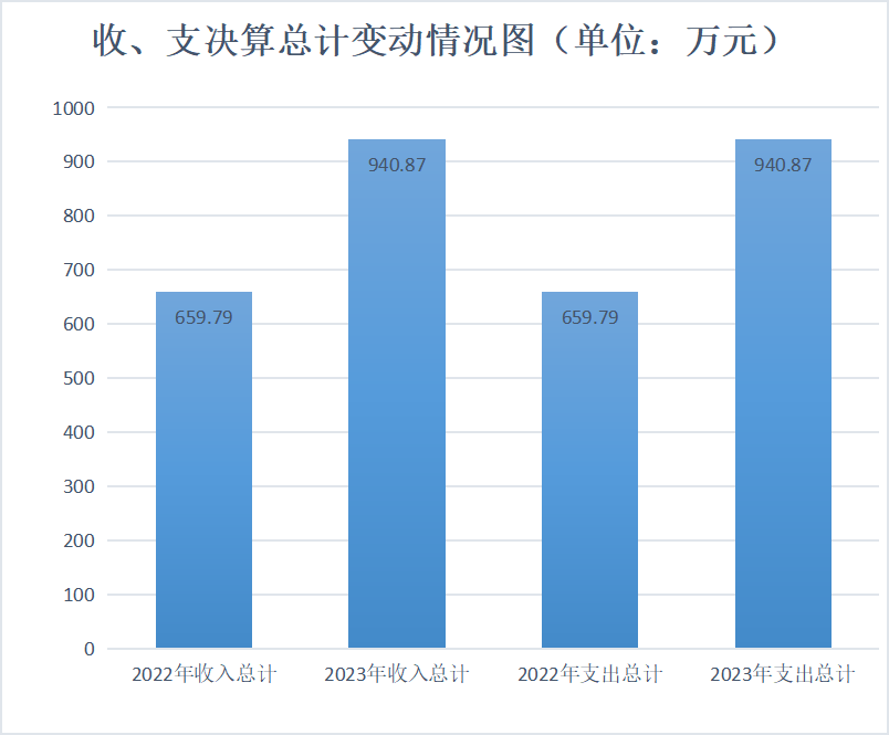 2023年度收、支总计均为940.87万元。与2022年度相比,收、支总计各增加281.08万元,增长42.60%。主要变动原因一是教师正常晋升及岗位变动工资增加,二是各类保险基数增加,保险缴费增加。三是公用经费财政拨款增加。