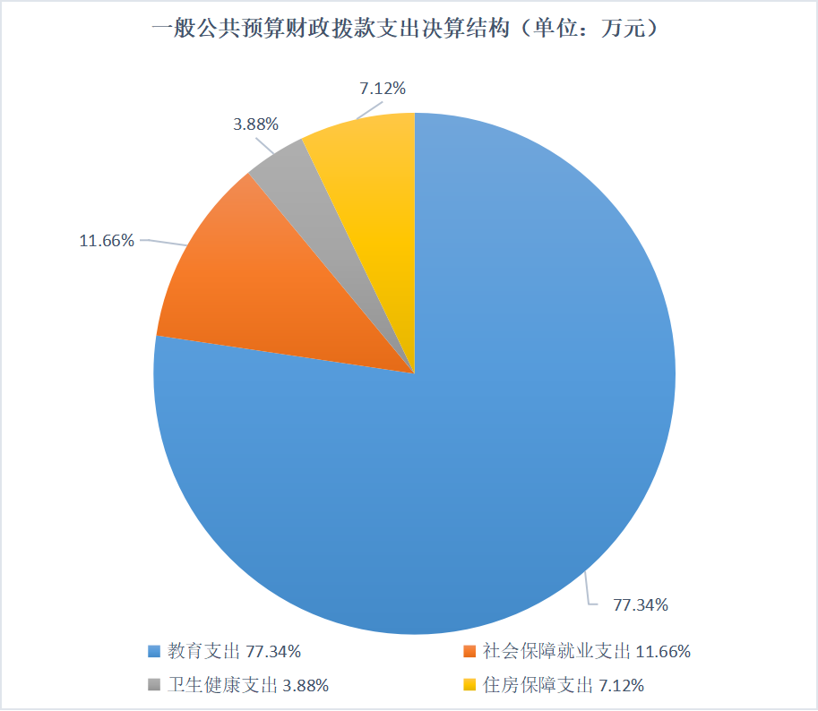 2023年度一般公共预算财政拨款支出903.2万元,主要用于以下方面:教育支出698.56万元,占77.34%;社会保障和就业支出105.4万元,占11.66%;卫生健康支出35万元,占3.88%;住房保障支出64.26万元,占7.12%。