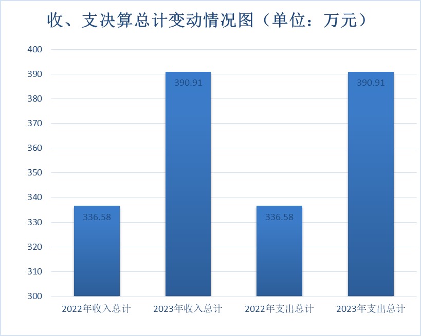 2023年度收、支总计均为390.91万元。与2022年度相比,收、支总计增加54.33万元,增长16.14%。主要变动原因一是教师正常晋升及岗位变动工资增加,教师人数增加。