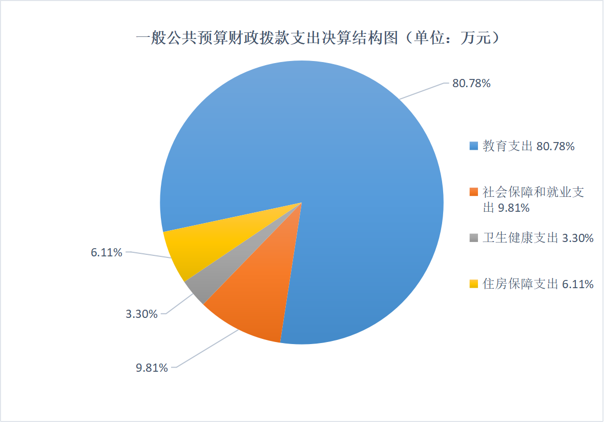 2023年度一般公共预算财政拨款支出712.96万元,主要用于以下方面:教育支出575.97万元,占80.78%;社会保障和就业支出70.00万元,占9.81%;卫生健康支出23.54万元,占3.30%;住房保障支出43.45万元,占6.11%。