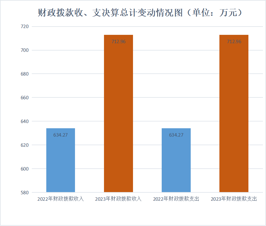 2023年度财政拨款收、支总计均为712.96万元。与2022年度相比,财政拨款收、支总计各增加78.69万元,增长11.03%。主要变动原因是一是教师正常晋升及岗位变动工资增加,二是退休一次性补贴增加,三是生均财政拨款增长等。
