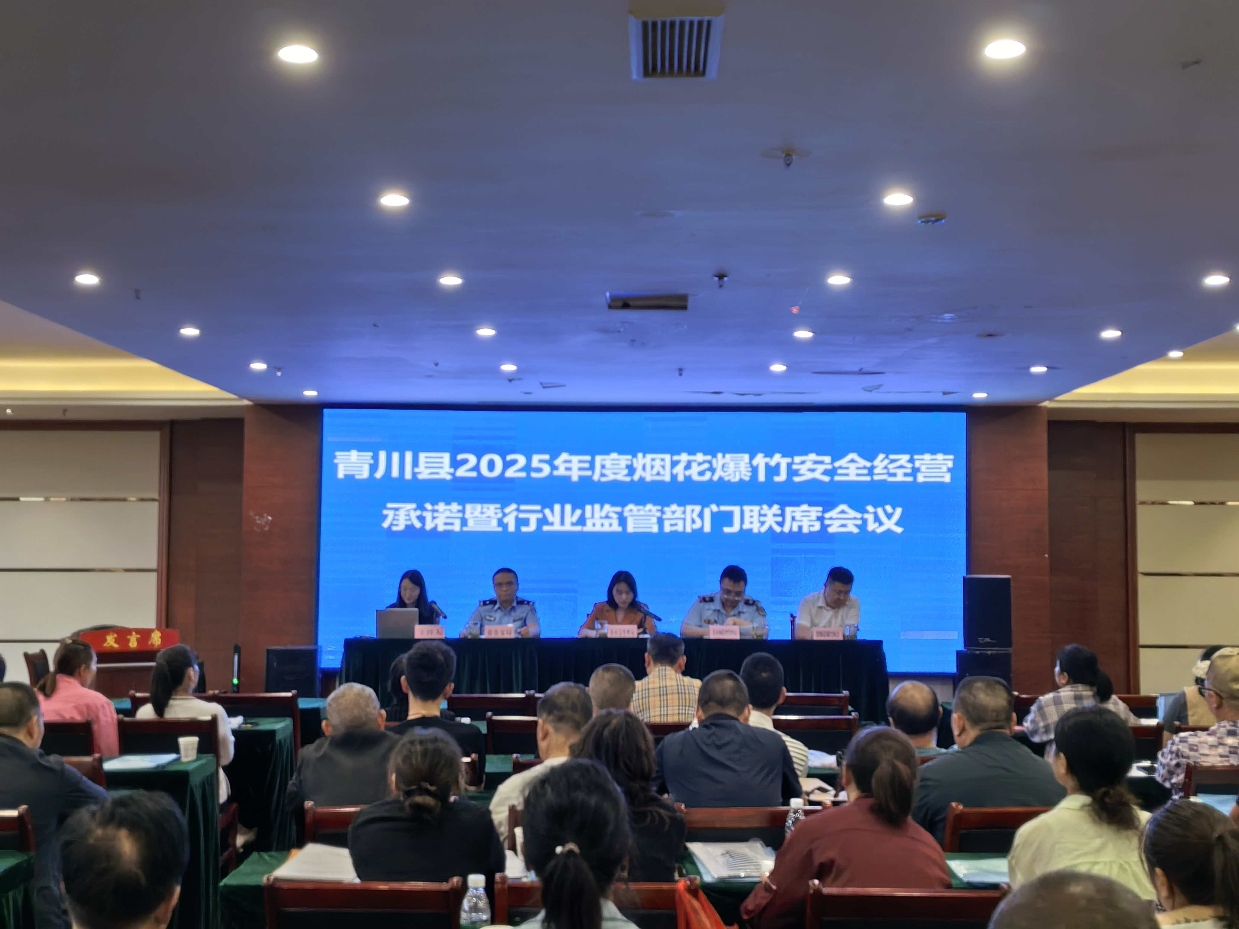 9月11日,青川县应急管理局组织召开2025年度烟花爆竹安全经营承诺暨行业监管部门联席会议。县应急管理局、公安局、市场监督管理局等相关部门负责人,以及全县烟花爆竹批发企业和零售户共约150人参加会议。