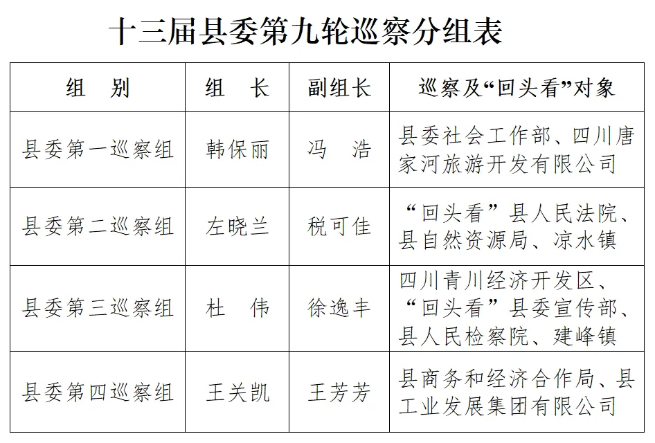 根据县委统一部署,十三届县委第九轮巡察将派出4个巡察组对县委社会工作部、县商务和经济合作局、四川青川经济开发区、县工业发展集团有限公司、四川唐家河旅游开发有限公司等5个党组织开展常规巡察,对县委宣传部、县人民法院、县人民检察院、县自然资源局、建峰镇、凉水镇等6个党组织开展巡察整改落实情况“回头看”。