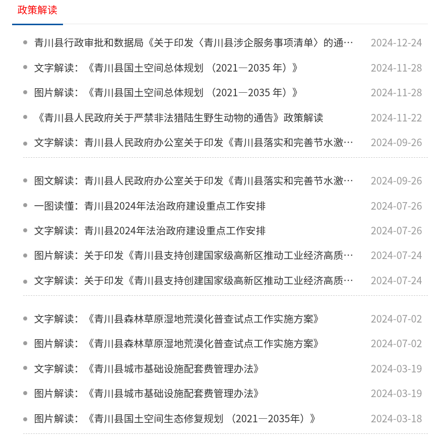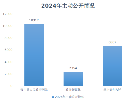 2024年,青川县政府门户网站公开各类信息10312条,其中,工作动态、公示公告、人事及招考等基本领域信息6485条;优化营商环境及就业创业、教育、医疗、养老等重点领域信息3476条。公开政府文件43个,发布政策解读25个。公开财政预决算和“三公”经费信息315条。更新发布2024年权责清单,公开行政执法信息265条,公开行政事业性收费和政府性基金目录清单,公开公共资源交易领域信息613条。及时准确公开县政府重要会议20条,通过县政府门户网站对重大行政决策发布民意征集10条,采纳意见建议5条。全县政府系统政务新媒体发布信息2354条,“掌上青川”APP发布信息6662条。