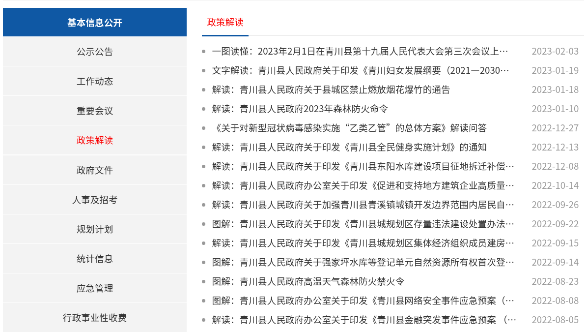 (三)政府信息管理情况。一是印发《青川县2022年政务公开重点任务分解表的通知》,对政务公开工作目标任务进行分解,细化工作内容,明确责任主体和时限要求,提升我县政务公开质量和水平,更好发挥以公开促落实、强监管的积极作用。二是严格落实信息发布“三审”制度,规范县政府门户网站和政务新媒体平台上对外公开的信息管理,确保信息发布准确、安全、高效。三是对主动公开基本目录和26个试点领域标准目录及时更新调整,确保信息公开标准化规范化。
