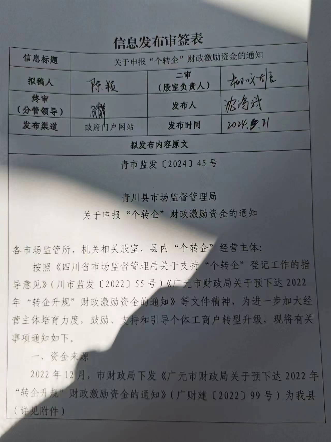 青川县市场监督管理局制定资金申报通知,在青川县政府网站公示30天,征求部门、社会意见。