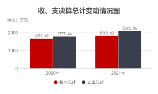 2021年度收入总计1818.62万元,支出总计2092.96万元。与2020年相比,收入总计增加165.13万元,增长10%。主要变动原因是招考录用在编人员增加导致的辖区人员类收入增加。与2020年相比,支出总计增加315.52万元,增长17.75%。主要变动原因是招考录用在编人员增加,人员类开支增多。