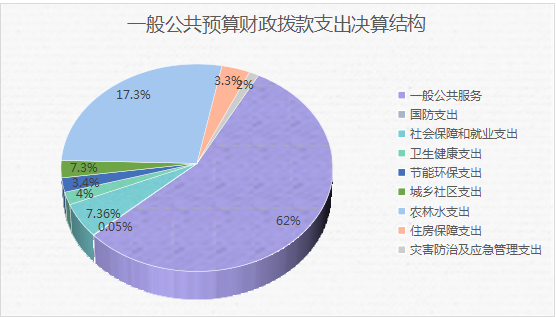2021年一般公共预算财政拨款支出2008.15万元,主要用于以下方面:一般公共服务(类)支出1248.6万元,占62%;国防支出(类)1.2万元,占0.05%;社会保障和就业支出(类)80.79万元,占4%;卫生健康支出(类)支出39.99万元,占2%;节能环保支出(类)支出68.54万元,占3.4%;城乡社区支出(类)148.3万元,占7.3%;农林水支出(类)348.77万元,占17.36%;住房保障支出(类)67.7万元,占3.3%。灾害防治及应急管理支出(类)4.26万元,占2.1%。(注:数据来源于财决01-1表,仅罗列本部门涉及的全部功能分类科目,至类级。)