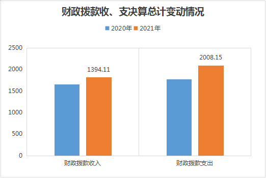2021年度财政拨款收入总计1394.11万元,财政拨款支出支出总计2008.15万元。与2020年相比,财政拨款收入总计各增加172.89万元,增长14%。主要变动原因是招考录用在编人员增加导致的辖区人员类收入增加。与2020年相比,财政拨款支出总计增加542.11万元,增长37%。主要变动原因是招考录用在编人员增加,人员类开支增多。