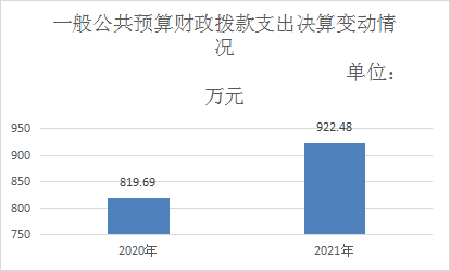 2021年公共预算一般支出922.48万元,较2020年819.69万元增加102.79万元,增加12.54%。