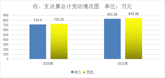 2021年度收入总计831.38万元、支出总计843.38万元。与2020年相比,收入总计增加116.98万元,增长16.37%。支出总计增加118.14万元,增长16.28%。主要变动原因是招考录用在编人员增加,导致人员基本支出及日常事务公用支出增加。