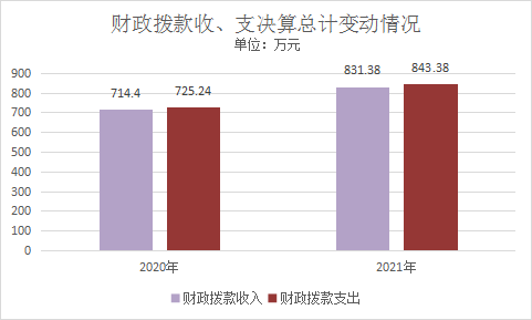 2021年度财政拨款收入总计831.38万元,财政拨款支出总计843.38万元。与2020年相比,财政拨款收入增加116.98万元,增长16.37%。与2020年相比,财政拨款支出增加118.14万元,增长16.28%。主要变动原因是招考录用在编人员增加,导致人员基本支出及日常事务公用支出增加。