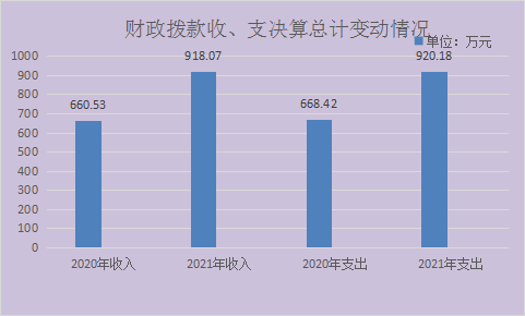 2021年财政拨款收、支总计918.07万元、920.18万元。与2020年相比,财政拨款收、支总计各增加257.54万元、251.76万元,增长38.99%、37.66%。主要变动原因是编制内实有人数增加,人员经费增加。
