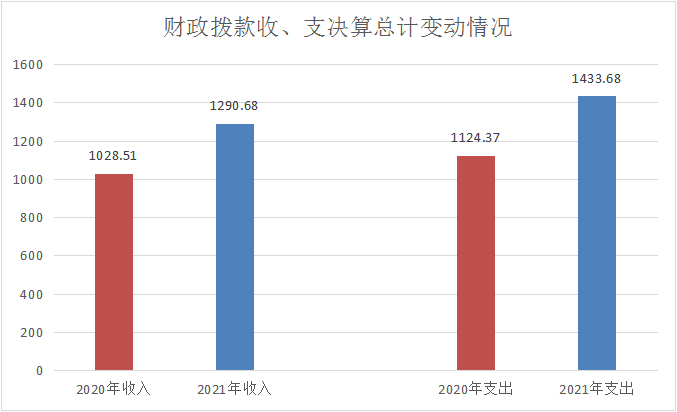 四、财政拨款收入支出决算总体情况说明 2021年财政拨款收入总计1290.68万元、支出总计1433.68万元。与2020年相比,财政拨款收入总计增加262.17万元、增长25.49%,支出总计增加309.31万元,增长27.51%。主要变动原因是编制内实有人数增加,人员基本支及日常事务公用支出收支增加。