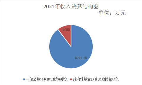 2021年本年收入合计9791.18万元,其中:一般公共预算财政拨款收入8791.18万元,占89.8%;政府性基金预算财政拨款收入1000万元,占10.2%。上级补助收入0万元,占0%;事业收入0万元,占0%;经营收入0万元,占0%;附属单位上缴收入0万元,占0%;其他收入0万元,占0%。