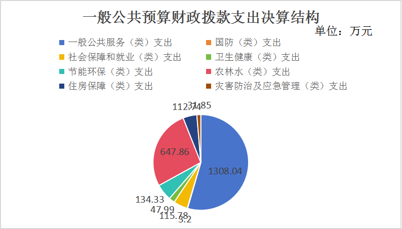 2022年一般公共预算财政拨款支出2401.79万元,主要用于以下方面:一般公共服务(类)支出1308.04万元,占54.46%;国防(类)支出3.2万元,占0.13%;社会保障和就业(类)支出115.78万元,占4.82%;卫生健康(类)支出47.99万元,占2%;节能环保(类)支出134.33万元,占5.59%;农林水(类)支出647.86万元,占26.97%;住房保障(类)支出112.74万元,占4.69%;灾害防治及应急管理(类)支出31.85万元,占1.33%。