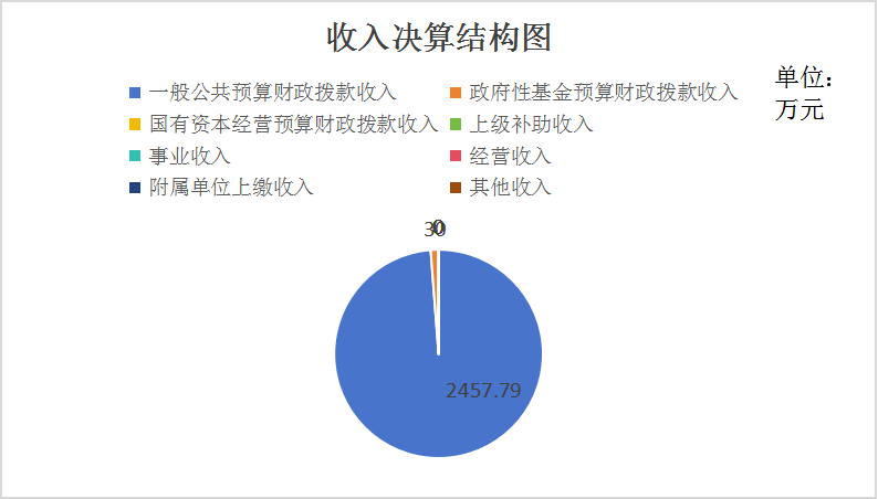 2022年本年收入合计2487.79万元,其中:一般公共预算财政拨款收入2457.79万元,占98.79%;政府性基金预算财政拨款收入30万元,占1.21%;国有资本经营预算财政拨款收入0万元,占0%;上级补助收入0万元,占0%;事业收入0万元,占0%;经营收入0万元,占0%;附属单位上缴收入0万元,占0%;其他收入0万元,占0%。