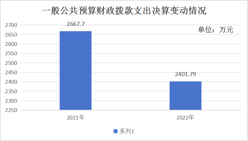 2022年一般公共预算财政拨款支出2401.79万元,占本年支出合计的98.77%。与2021年相比,一般公共预算财政拨款支出减少265.91万元,减少9.97%。主要变动原因是2022年我单位编制内实有人数减少,导致人员基本支出及日常事务公用支出收支减少。