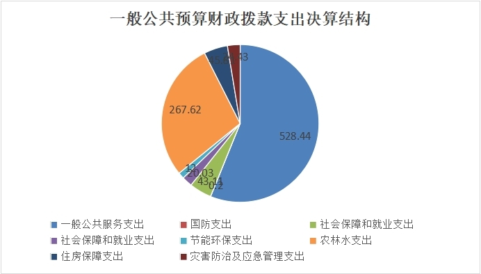 2022年一般公共预算财政拨款支出941.63万元,主要用于以下方面:一般公共服务支出528.44万元,占56.12%;国防支出0.2万元,占0.02%;社会保障和就业支出43.11万元,占4.58%;卫生健康支出20.03万元,占2.13%;节能环保支出12万元,占1.27%;农林水支出267.62万元,占28.42%,住房保障支出45.81万元,占4.86%;灾害防治及应急管理支出24.43万元,占2.59%。