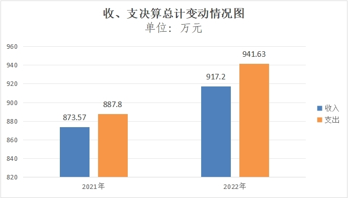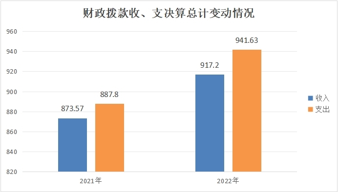 2022年财政拨款收入总计917.20万元、支出总计941.63万元。与2021年相比,财政拨款收入总计增加43.63万元、支出总计增加53.83万元,分别增长4.99%、6.06%。主要变动原因是区划调整后我单位编制内实有人数增加,导致人员基本支出及日常事务公用支出收支增加。