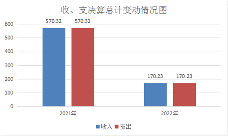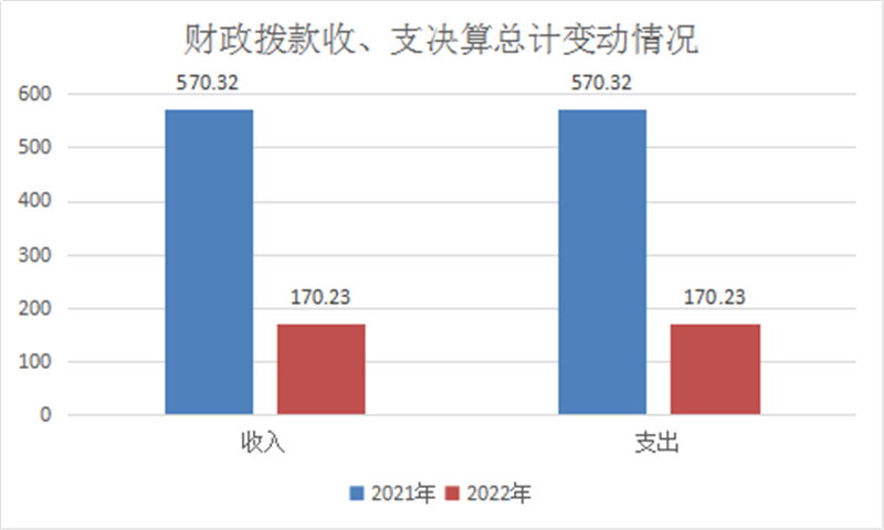 2022年度收入170.23万元。与2021年相比,收入总计减少400.09万元,下降64.75%。支出总计170.23万元。与2021年相比,支出总计减少400.09万元,下降64.75%%。主要变动原因是日常公用经费、基础设施建设、办公设备、专用设备等费用减少。
