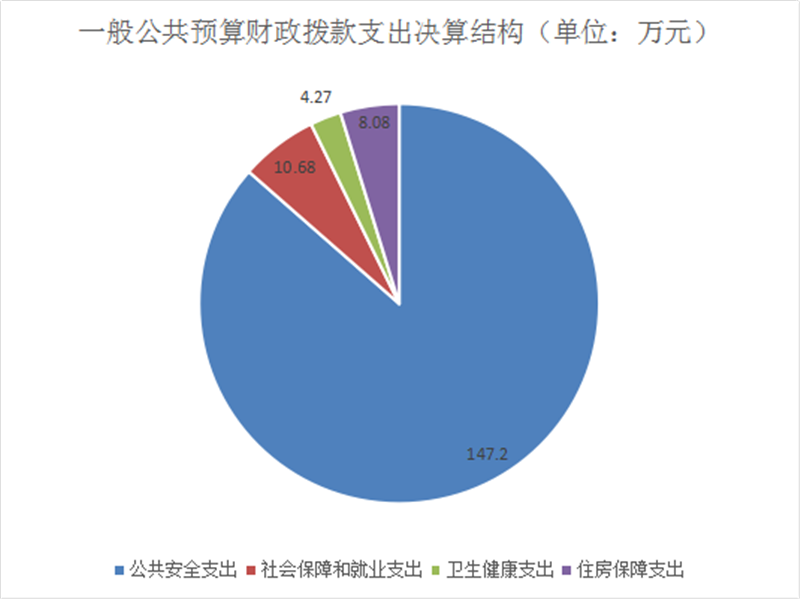 2022年一般公共预算财政拨款支出170.23万元,主要用于以下方面:公共安全支出147.2万元,占86.47%;社会保障和就业支出10.68万元,占6.27%;卫生健康支出4.27万元,占2.51%;住房保障支出8.08万元,占4.75%。